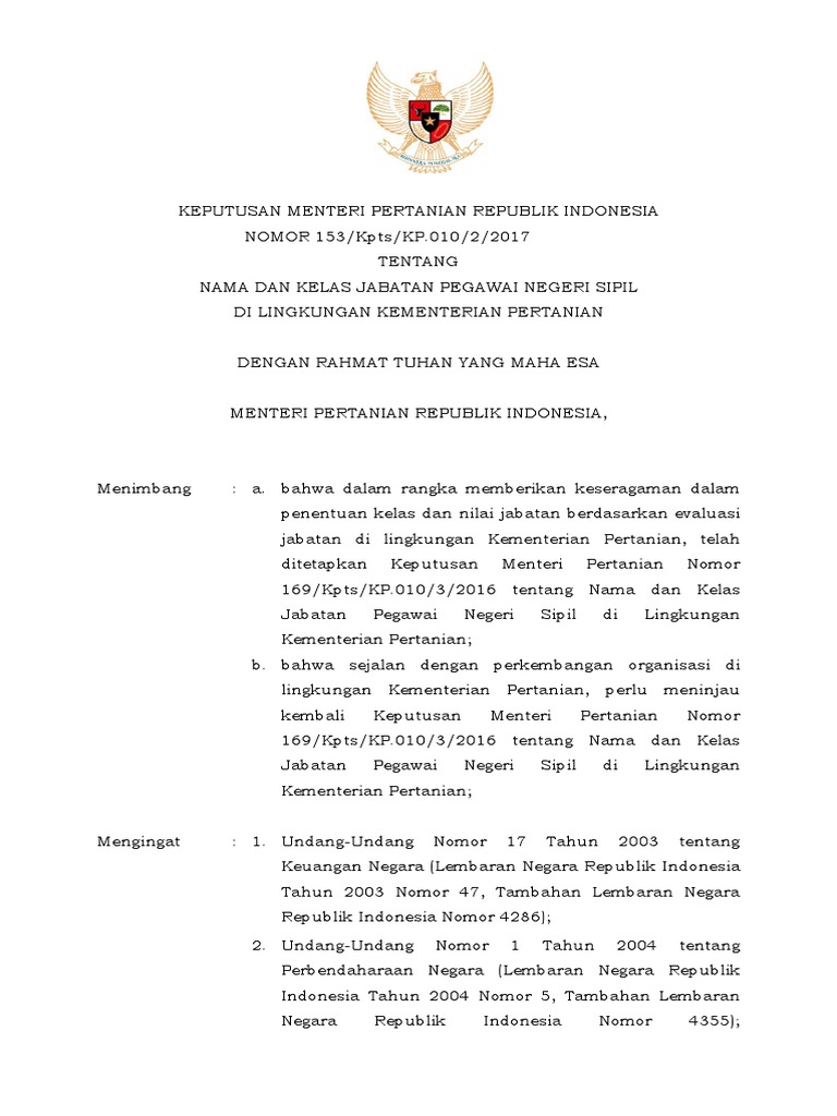 Kepmentan 153 Tahun 2017 Nama Dan Kelas Jabatan Pdf